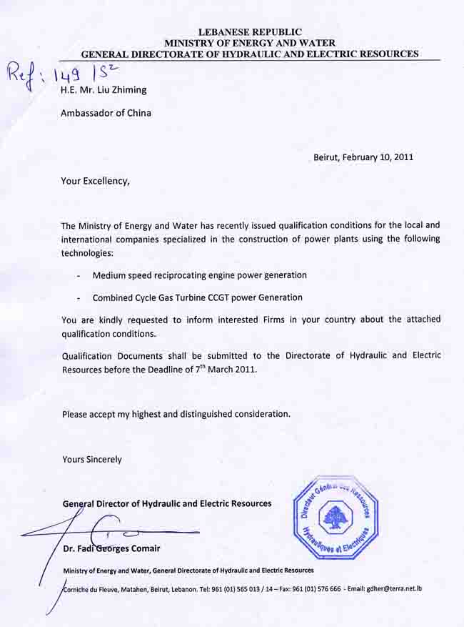 黎巴嫩能源水利部邀请中国电力公司参与电站建设的资格审查(急!)